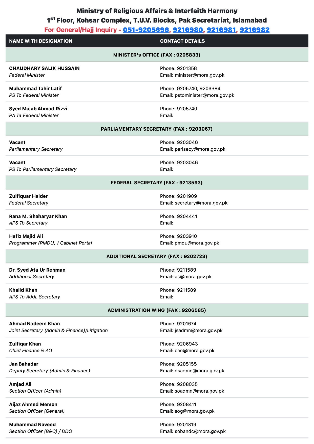 Ministry Telephone Contact List